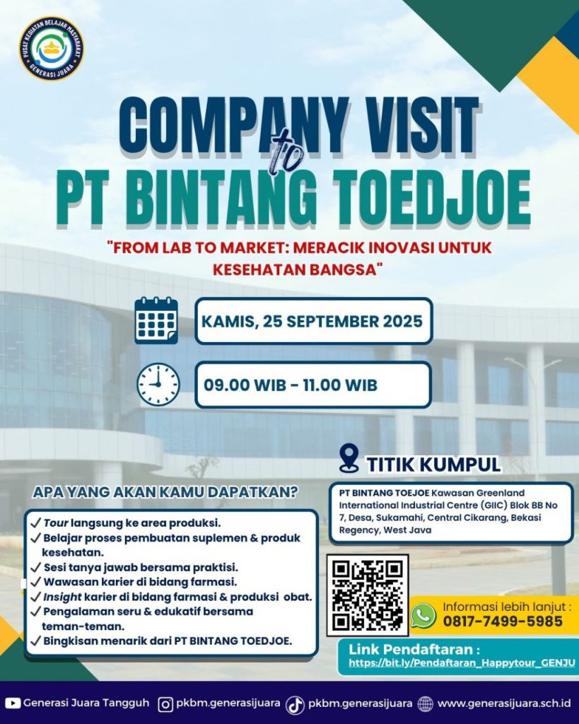 peserta akan melakukan kunjungan langsung ke PT Bintang Toedjoe, perusahaan farmasi ternama di Indonesia yang memproduksi berbagai produk kesehatan populer.