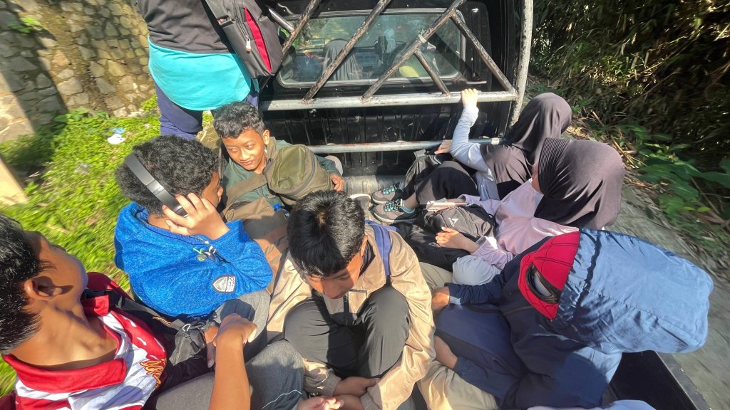 Kendaraan ini menambah seru pengalaman mereka, yaitu mobil pick up! Tak jarang sewaktu mobil melaju dengan kencang, mereka melompat-lompat di bagian bak mobil saat menuju basecamp pendakian, membuat beberapa siswa merasa semakin tertantang.